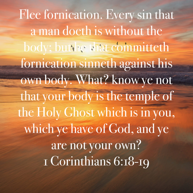 Lastly but definitely not less, is my arch enemy. Fornication (but really it is Satan)! This was the hardest sin from my past which was so hard for me to overcome but by the grace of God, Jesus delivered me and set me free. In the book of 1 Corinthians 6:18-19 in the bible, it explains that this particular sin is not just a sin but it is a sin that we do against our own bodies. When you said yes to Jesus you also gave him your body like a wife or husband gives their body to their spouse. Our bodies are now the temple of the Holy Ghost. Fornication is one of the hardest things to overcome because God only intended for sex to be between a husband and wife. Through sex the two become one in the most intimate way and they will create a bond through this intimate act. So when you do this act with someone who is not our spouse you are creating a serious problem for yourself that will be very hard to overcome. Fornication is a very dangerous thing and although you can break up with that person the desire for sex is still there. This desire is very strong and this is why it is hard to stop fornicating.